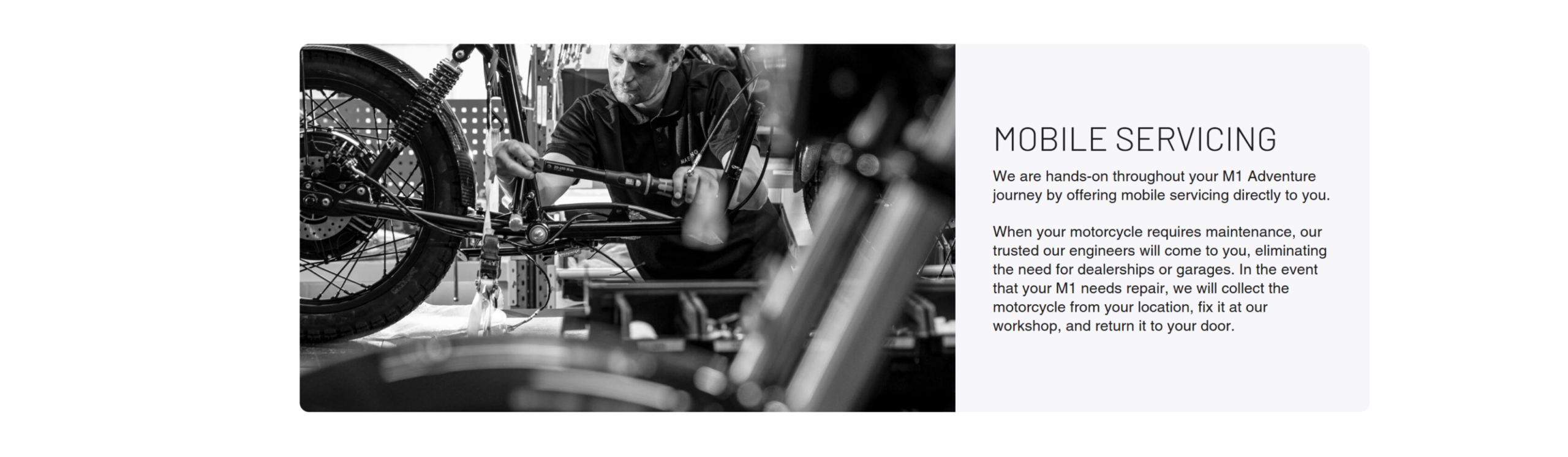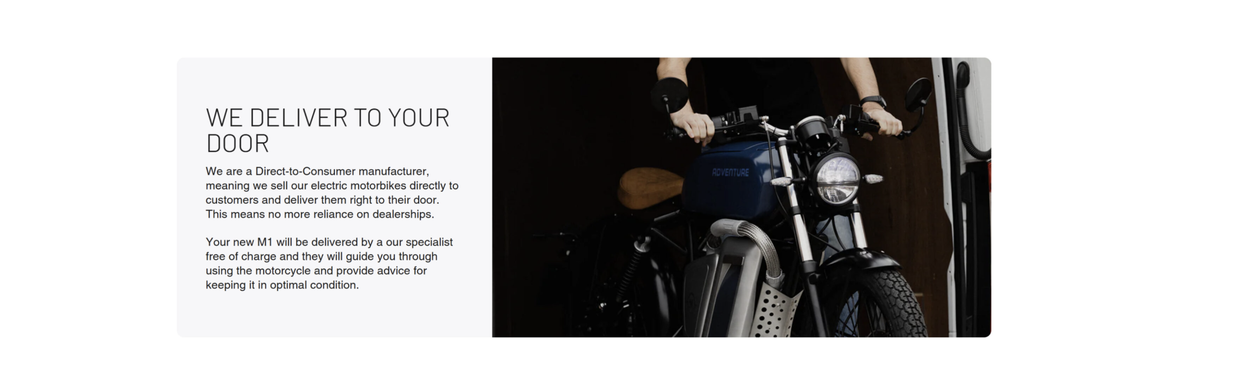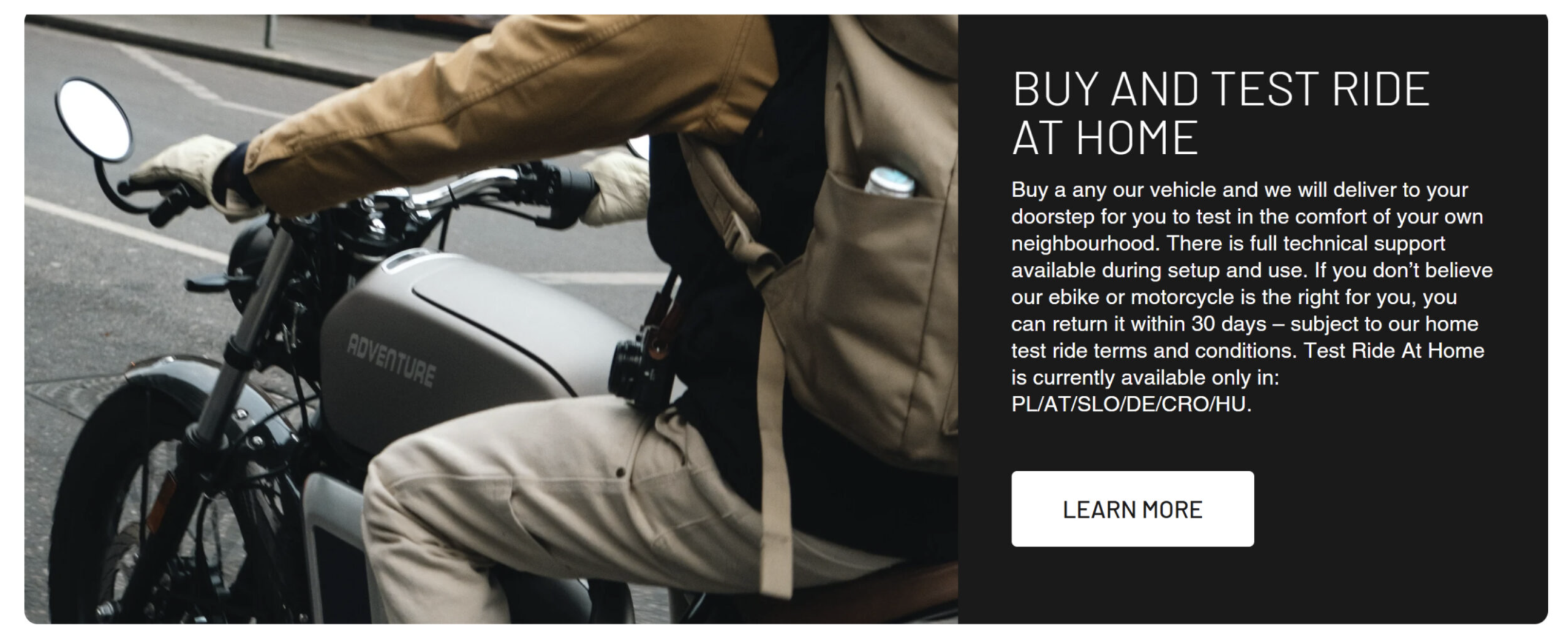 You can try a M1 for 30 days, risk-free. If you are not 100% satisfied, you may return the motorbike for a prompt, full refund.