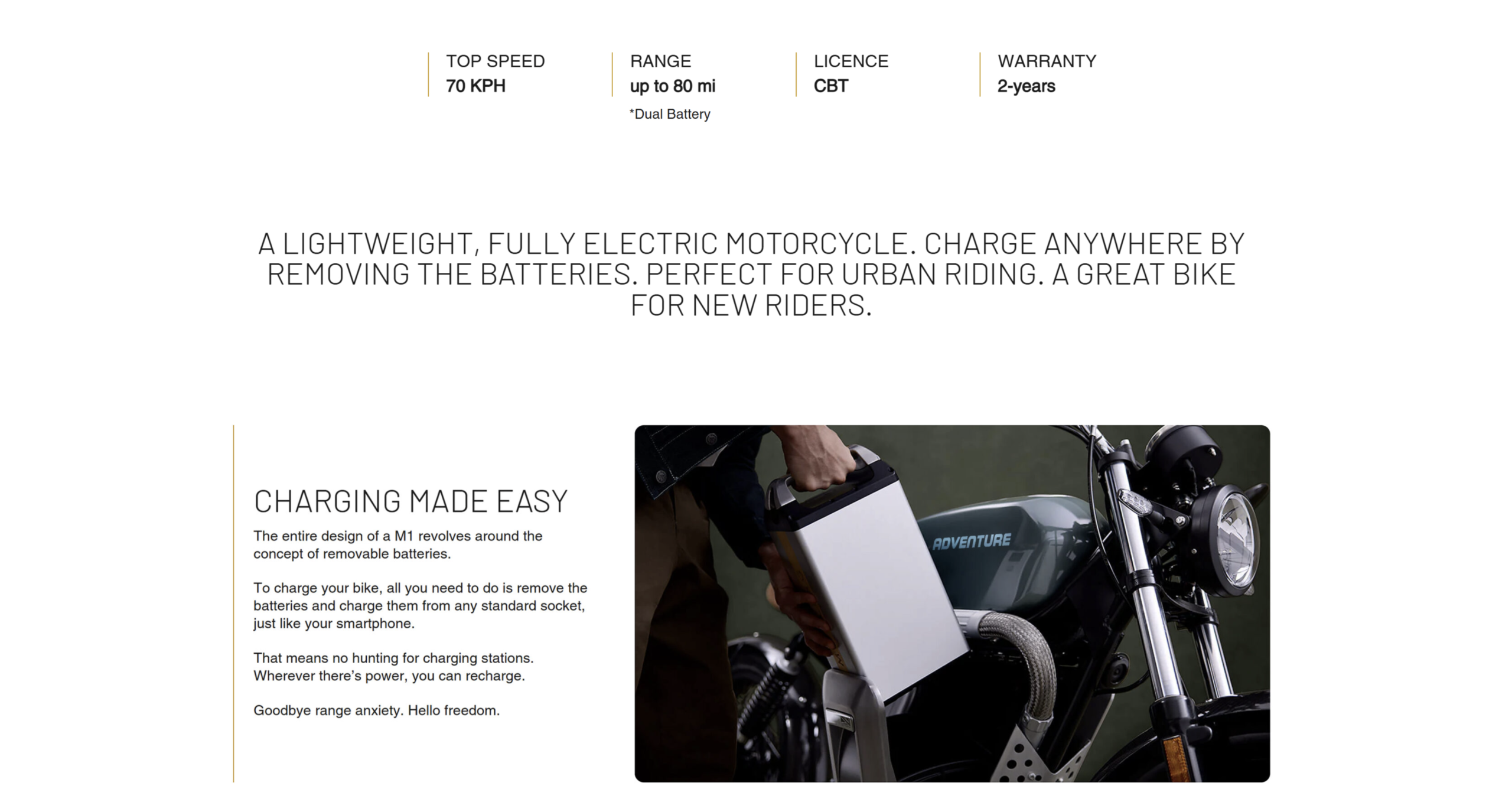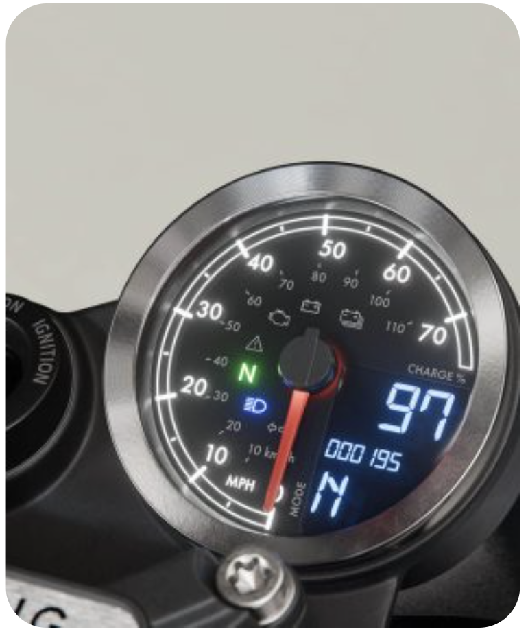 *We calculate range using the World Motorcycle Test Cycle (WMTC), which is a European industry standard that measures the range of a vehicle based on a variety of testing scenarios, including representative urban use (for which the RM1S has been designed), and extended periods at higher speeds as certified by the homologation authority. Single battery                                                      Max. Range – up to 65 km WMTC* Range – up to 29 miles Dual battery                                                         Max. Range – up to 47 km WMTC* Range – up to 100 km Three ride modes                                                Mode 1 = 72 kph top speed Mode 2 = 45 kph top speed Mode 3 = 32 kph top speed